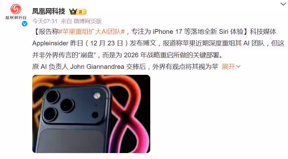 12 月 24 日消息,科技媒体 Appleinsider 昨日(12 月 23 日)发布博文,报道称苹果近期深度重组其 AI 团队,但这并非外界传言的“崩盘”,而是为 2026 年战略重启所做的关键部署。