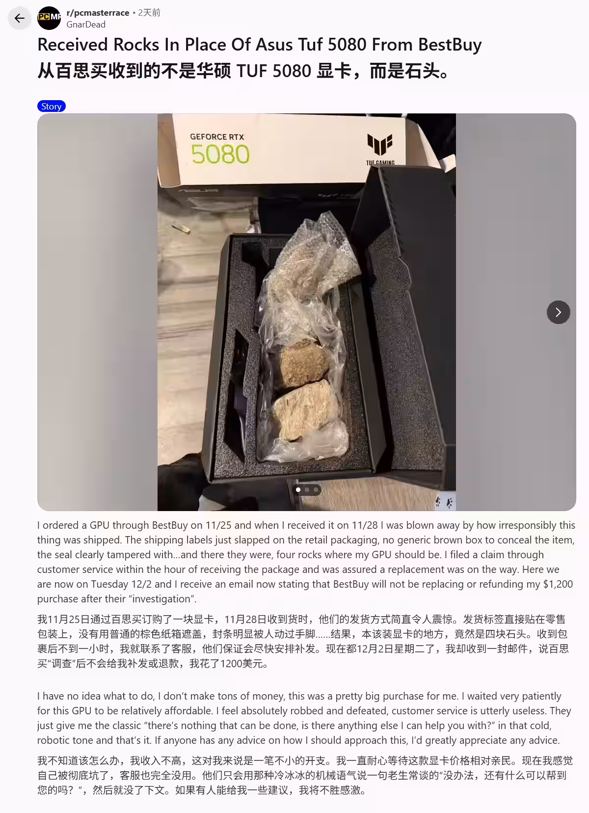 他打开箱子后果然发现显卡不翼而飞,取而代之的是几块石头。