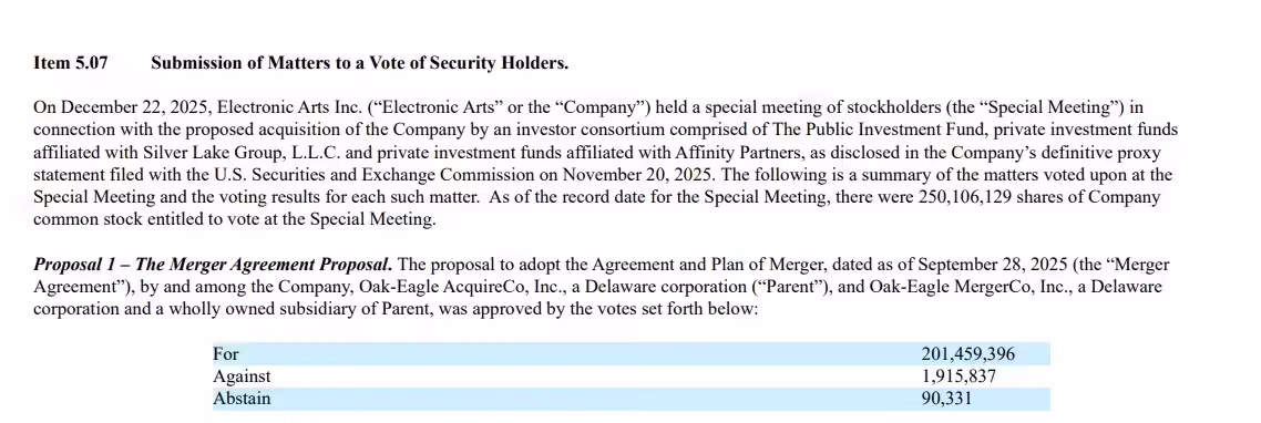 美国证券交易委员会(SEC)的文件显示,99% 的股东投票赞成将公司出售给沙特投资基金。艺电目前共有约 2.03 亿股股份,其中约 2.01 亿股的股东对该交易投了赞成票。
