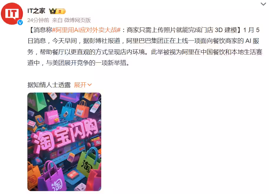 1 月 5 日消息,今天早间,据彭博社报道,阿里巴巴集团正在上线一项面向餐饮商家的 AI 服务,帮助餐厅以更直观的方式呈现店内环境。此举被视为阿里在中国餐饮和本地生活赛道中,与美团展开竞争的一项新举措。