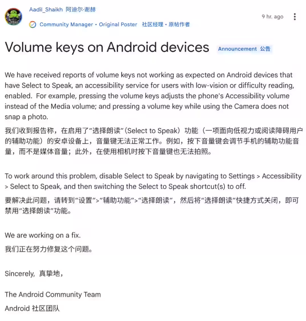 谷歌社区经理 Aadil Shaikh 在回应中承认了这一问题,他表示:“我们已收到报告,开启 Select to Speak 服务的安卓设备出现了音量键工作不符合预期的情况。”