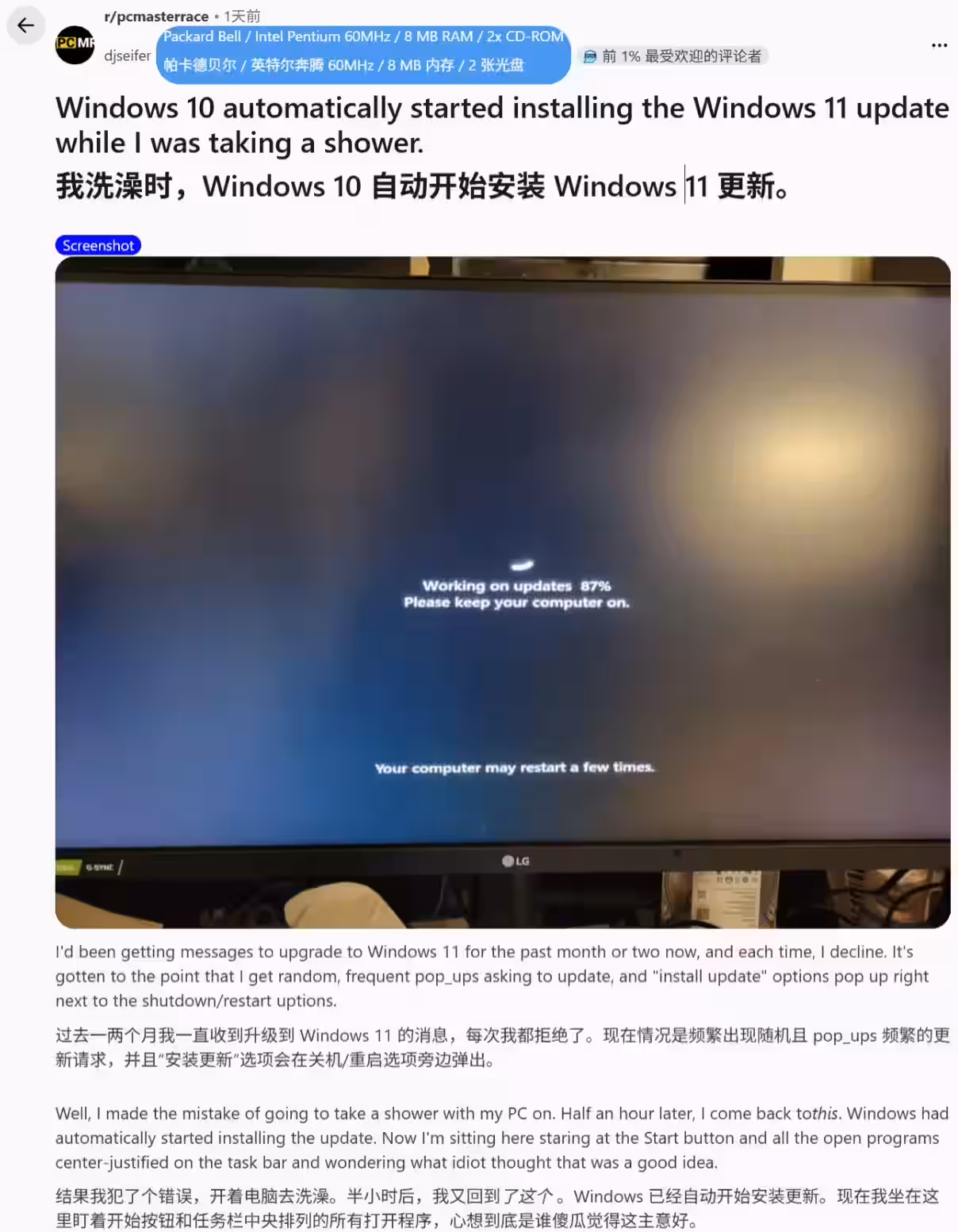 该网友表示,自己仅仅离开电脑去洗了半小时澡,回来后就发现系统已经“擅作主张”开始了升级流程。由于极度反感强制升级行为和 Windows 11 的界面设计,这名愤怒的用户在帖子中直呼微软此举简直是“白痴”。